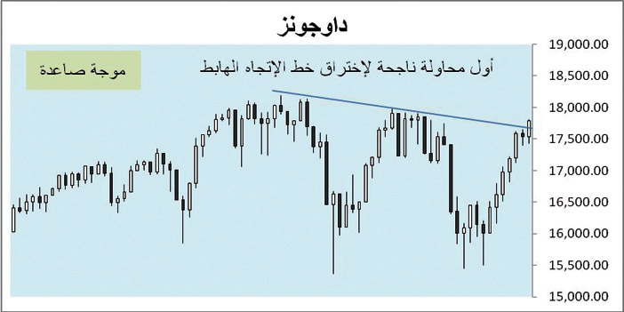 افتتح مؤشر الداوجونز الأسبوع الماضي على هبوط إلى مستوى 17434 نقطة كاسرًا خط الاتجاه الهابط الموضح بالرسم البياني أعلاه، ثم حدث ارتداد جيد واختراق خط الاتجاه الهابط رغم سلبية البيانات الاقتصادية، وخصوصًا من سوق العمل. ويرجح الأسبوع المقبل أن يعود للهبوط بشكل عنيف؛ لأن النمط المتشكل - وهو حرف W - خادع وليس في مكانه. ويتوقع أن يكون أول الدعوم خلال الأسبوع هو 17244 نقطة بنمط بيعي قوي جدًّا.