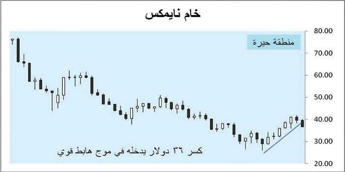 غادر خام نايمكس منطقة الأربعين دولارًا بعد ثلاثة أسابيع من الحيرة والتردد، وبعد تطابق سعري مع خام برنت الأكثر مبيعًا في العالم، لكن مع نهاية الأسبوع هبط بقوة بعد مخاوف من سياسات مرتقبة بشأن تجميد الإنتاج، وتزامن ذلك مع انخفاض في قيمة الدولار أمام سلة عملاته. ويرجح الأسبوع المقبل أن يكسر مستوى 36 دولارًا، ويدخل رسميًّا في موجة هبوط من المرجح أن تكون قوية، وخصوصًا مع انخفاض شهية المخاطرة في الأسواق.