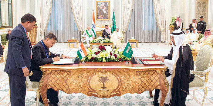 وعقب جلسة المباحثات الرسمية، قلد خادم الحرمين الشريفين الملك سلمان بن عبدالعزيز آل سعود، دولة الرئيس ناريندرا مودي رئيس وزراء الهند «وشاح الملك عبدالعزيز» تقديراً لدولته. إثر ذلك وبحضور خادم الحرمين الشريفين الملك سلمان بن عبدالعزيز آل سعود، ودولة رئيس وزراء الهند ناريندرا مودي جرى التوقيع على اتفاقية تعاون وبرنامجي تعاون وبرنامج تنفيذي ومشروع مذكرة تفاهم بين حكومتي المملكة العربية السعودية وجمهورية الهند، حيث تم توقيع برنامج تعاون لترويج الاستثمارات بين الهيئة العامة للاستثمار في المملكة وهيئة الاستثمار الهندية، وقعها من الجانب السعودي صاحب السمو الملكي الأمير سعود بن خالد الفيصل الرئيس التنفيذي لأنظمة وسياسات الاستثمار بالهيئة العامة للاستثمار، ومن الجانب الهندي وكيل وزارة الشؤون الخارجية للعلاقات الاقتصادية إمار سنها. كما جرى التوقيع على برنامج تعاون فني في مجالات التقييس وقعها من الجانب السعودي نائب المحافظ للمطابقة والجودة بالهيئة السعودية للمواصفات والمقاييس والجودة سعود بن راشد العسكر، ومن الجانب الهندي السفير لدى المملكة أحمد جاويد. وتم توقيع اتفاقية تعاون عمالي في مجال توظيف العمالة العامة بين وزارة العمل في المملكة ووزارة الشؤون الخارجية في الهند وقعها من الجانب السعودي وكيل وزارة العمل للشؤون العمالية الدولية زياد بن إبراهيم الصايغ، ومن الجانب الهندي السفير لدى المملكة أحمد جاويد. كما جرى التوقيع على برنامج تنفيذي للتعاون في مجال الحرف والصناعات اليدوية بين الهيئة العامة للسياحة والتراث الوطني ومجلس ترويج صادرات الحرف والصناعات اليدوية الهندي، وقعها من الجانب السعودي المشرف العام على المركز الوطني للحرف والصناعات اليدوية بالهيئة الدكتور جاسر بن سليمان الحربش، ومن الجانب الهندي السفير لدى المملكة أحمد جاويد. وتم التوقيع على مشروع مذكرة تفاهم بين وحدة التحريات المالية السعودية ووحدة التحريات المالية الهندية حول التعاون في مجال تبادل المعلومات الاستخبارية المتعلقة بغسل الأموال وتمويل الجرائم والإرهاب، وقعها من الجانب السعودي مدير عام الإدارة العامة للتحريات المالية اللواء فهد بن عبدالعزيز المغلوث، ومن الجانب الهندي وكيل وزارة الشؤون الخارجية للعلاقات الاقتصادية إمار سنها. حضر جلسة المباحثات صاحب السمو الملكي الأمير فيصل بن بندر بن عبدالعزيز أمير منطقة الريض، وصاحب السمو الملكي الأمير متعب بن عبدالله بن عبدالعزيز وزير الحرس الوطني، وصاحب السمو الملكي الأمير محمد بن نايف بن عبدالعزيز ولي العهد نائب رئيس مجلس الوزراء وزير الداخلية، ومعالي وزير الدولة عضو مجلس الوزراء الدكتور مساعد بن محمد العيبان، ومعالي وزير المالية الدكتور إبراهيم بن عبدالعزيز العساف، ومعالي وزير الاقتصاد والتخطيط المهندس عادل بن محمد فَقيه الوزير المرافق، ومعالي وزير التجارة والصناعة الدكتور توفيق بن فوزان الربيعة، ومعالي وزير الثقافة والإعلام الدكتور عادل بن زيد الطريفي، ومعالي وزير الخارجية الأستاذ عادل بن أحمد الجبير، ومعالي وزير الصحة المهندس خالد بن عبدالعزيز الفالح، وسفير خادم الحرمين الشريفين لدى الهند الدكتور سعود بن محمد الساطي. كما حضرها من الجانب الهندي، معالي مستشار الأمن الوطني وزير الدولة آجيت دوفال، ومعالي وكيل وزارة الشؤون الخارجية الدكتور آس جايشانكار، وسفير الهند لدى المملكة أحمد جاويد، ووكيل وزارة الشؤون الخارجية للعلاقات الاقتصادية إمار سنها، والوكيل المشترك بوزارة الشؤون الخارجية فيكاس سواروب، والوكيل المشترك بمكتب رئيس الوزراء آيه كيه شارما، والوكيل المشترك بمكتب رئيس الوزراء فيناي موهن كواترا، والوكيل المشترك بوزارة الشؤون الخارجية مريدول كومار، وعدد من المسؤولين.