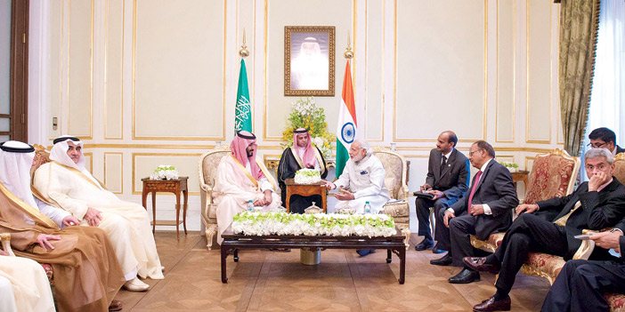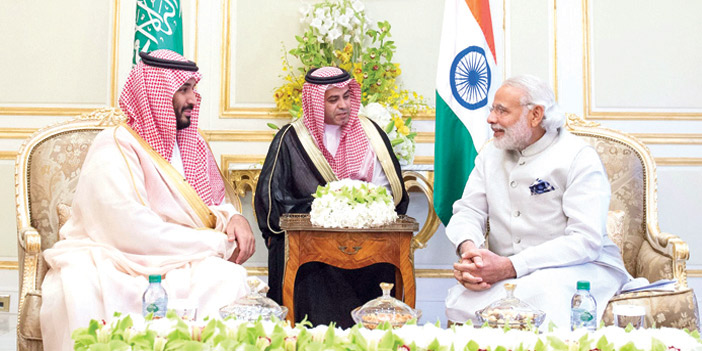 التقى صاحب السمو الملكي الأمير محمد بن سلمان بن عبدالعزيز ولي ولي العهد النائب الثاني لرئيس مجلس الوزراء وزير الدفاع في الرياض مساء أمس دولة رئيس وزراء جمهورية الهند ناريندرا مودي. وجرى خلال اللقاء بحث فرص التعاون الثنائي بين البلدين، ومستجدات الأوضاع في المنطقة، والمسائل ذات الاهتمام المشترك. حضر اللقاء معالي وزير الاقتصاد والتخطيط المهندس عادل فقيه الوزير المرافق، ومعالي وزير الخارجية الأستاذ عادل الجبير، ومعالي المستشار بالديوان الملكي الأستاذ أحمد الخطيب ومعالي المستشار في الديوان الملكي المشرف العام على مكتب سمو وزير الدفاع الأستاذ فهد العيسى ومعالي نائب الرئيس العضو المنتدب بالصندوق السعودي للتنمية المهندس يوسف البسام وعدد من المسئولين، والوفد الرسمي المرافق لرئيس جمهورية الهند.