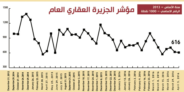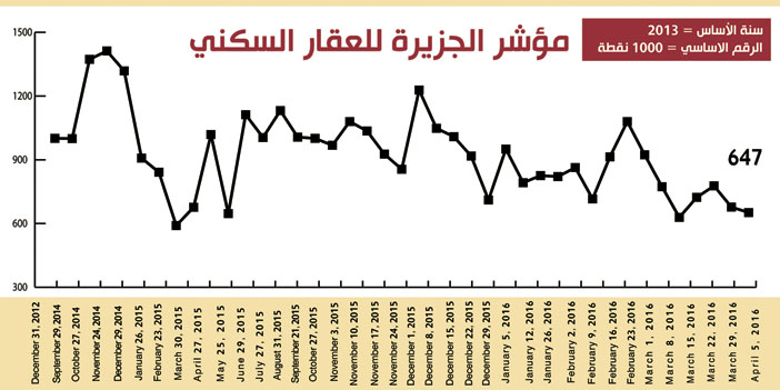 عاود مؤشر الجزيرة للعقار السكني ليكمل سلسلة انخفاضاته المستمرة بعد ارتفاع وحيد حققه قبل أسبوع، حيث انخفض في تداولات الأسبوع الماضي بنسبة 3.9 بالمائة خلال تداولات الأسبوع الماضي ليغلق المؤشر عند مستوى 647 نقطة، مقارنة بإغلاق 673 نقطة للأسبوع قبل الماضي، وبالنظر إلى أداء القطاعات المكونة للمؤشر، فقد جاء هذا الانخفاض في المؤشر نتيجة انخفاض النشاط في قطاع الأرضي السكنية بنسبة 5.8 بالمائة، كذلك انخفاض النشاط في قطاع الأراضي الزراعية التي تندرج تحت القطاع السكني بنسبة 1 بالمائة، وفي المقابل سجل النشاط ارتفاعا في قطاع الشقق السكنية بنسبة 6.5 بالمائة، وسجل قطاع الفلل ارتفاعا بالنشاط بنسبة 40 بالمائة. أما بالنسبة لقيمة متوسط المؤشر لآخر 3 أشهر فقد بلغت 685 نقطة متراجعا عن مستواه السابق بخمس نقاط، أي أن القيمة الحالية للمؤشر أقل من هذا المتوسط بنحو 6 بالمائة، وبنظرة أكثر دقة على النشاط في القطاع السكني فيتضح من خلال التراجع المستمر في قيمة متوسط 3 أشهر أن ضعف الاقبال على شراء الأراضي يتزايد مع الوقت كذلك الفلل، أما قطاع الشقق فيبدو أكثر استقرارا وإن كان يميل إلى التراجع بشكل طفيف. أما أداء المؤشر خلال 2016 فقد انخفض بنسبة 4.6 بالمائة، فيما بلغت نسبة الانخفاض في المؤشر منذ سنة التأسيس 35.8 بالمائة.