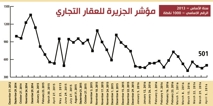 وبالنظر إلى قيمة متوسط مؤشر الجزيرة التجاري لآخر 3 أشهر، فقد بلغت 504 نقطة متراجعا عن مستواه السابق بنحو 11 نقطة أي القيمة للحالية للمؤشر قريبة من قيمة هذا المتوسط، وما يزال المؤشر التجاري أكثر استقرارا في الفترة الأخيرة من المؤشر السكني نتيجة عمليات شراء واضحة في قطاع الأراضي الزراعية والتي سبق أن نوهنا عنها قبل عدة أسابيع. أما أداء المؤشر منذ بداية العام 2016 فقد انخفض بنسبة 9.7 بالمائة، أما التغير في قيمة المؤشر منذ سنة التأسيس (عام 2013) فما زال متراجعا بنسبة 49.9 بالمائة.