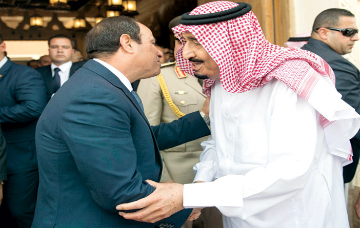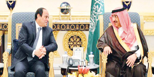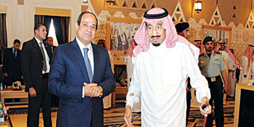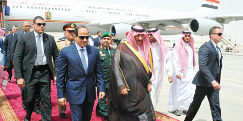 - في الثاني من مايو 2015 قام الرئيس السيسى بزيارة للمملكة التقى به خادم الحرمين الشريفين وعقدا مباحثات عكست قوة ومتانة العلاقات التاريخية والوثيقة التي تجمع البلدين، كما استعرضا مستجدات الأوضاع على الساحتين العربية والإقليمية، لاسيما فيما يتعلق بالتطورات الجارية في اليمن وسبل الحفاظ على وحدة هذا البلد الشقيق وسلامة أراضيه ومؤسساته الشرعية، فضلاً عن أهمية تكاتف جهود المجتمع الدولي لعدم السماح بالمساس بأمن البحر الأحمر وتهديد حركة الملاحة الدولية.