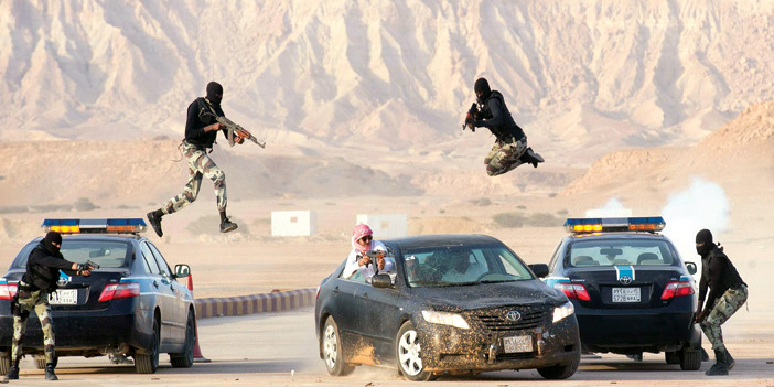 رعى صاحب السمو الملكي الأمير محمد بن نايف بن عبدالعزيز ولي العهد نائب رئيس مجلس الوزراء وزير الداخلية، امس انطلاق فعاليات التمرين التعبوي لقوات الطوارئ الخاصة « صولة الحق 8 « . وكان في استقبال سموه لدى وصوله مركز الأمير نايف للعمليات الخاصة والتطبيقات المتقدمة بمحافظة ضرماء معالي مدير الأمن العام الفريق عثمان بن ناصر المحرج، وقائد قوات الطوارئ الخاصة اللواء خالد بن قرار الحربي، وكبار ضباط قوات الطوارئ الخاصة. وقبيل انطلاق فعاليات التمرين، استقبل سمو ولي العهد، مديري وقادة الأمن والطوارئ والدرك من الدول الخليجية والعربية والإسلامية الذين قدموا لحضور فعاليات التمرين. وفور وصول سمو ولي العهد عزف السلام الملكي. وبعد أن أخذ سموه مكانه في المنصة الرئيسة بدأ الحفل الخطابي بتلاوة آي من الذكر الحكيم. ثم ألقى مدير الأمن العام كلمة رحب خلالها بسمو ولي العهد - حفظه الله -، مؤكدًا جاهزية الأمن عامة في التصدي والوقوف بوجه كل مفسد وعابث بأمن الوطن. وأوضح معاليه أن تمرين «صولة الحق» يأتي للحق والعدل والهيبة ويؤكد دوام المملكة حامية لحمى الدين الحنيف راعية لمقدساتها، مبينا أن شعب المملكة أثبت عبر تاريخه وحاضره الزاهر أعظم معاني المسؤولية الإسلامية والعربية في رعاية الإسلام والمسلمين. ونوه معالي مدير الأمن العام بأن تمرين صولة الحق» 8 « هو من أحد معالم القوة والهيبة التي أمرنا الله عز وجل في مواجهة أعداء الإسلام للتصدي للإرهاب بجميع صوره الإجرامية وليؤكد بذلك ما توصلت إليه بلادنا من ريادتها ونجاحها في مواجهة ومكافحة هذا الخطر بشهادة دول العالم، مشيرا إلى أن التمرين يؤكد جاهزية واستعداد قوات الأمن عامة وقوات الطوارئ الخاصة على وجه الخصوص لأي مهمة وواجب وطني لفرض الحق والعدل وحماية الوطن والمقيمين على أرضه ومقدساته ومقدراته. وفي ختام كلمته دعا الله عز وجل أن يحفظ هذا الوطن الغالي بقيادة خادم الحرمين الشريفين الملك سلمان بن عبدالعزيز آل سعود وسمو ولي عهده الأمين وسمو ولي ولي العهد - حفظهم الله - وأن يديم نعمة الأمن والأمان والاستقرار والتلاحم لوطننا. إثر ذلك شاهد سمو ولي العهد والحضور فعالية « توثيق مسيرة قائد «، قدم فيه عدد من الضباط الجامعيين الخريجين عددا من تكتيكات الرماية على أهداف أظهرت بعد إصابتها لوحات تحمل معلومات لمسيرة سمو الأمير محمد بن نايف بن عبدالعزيز منذ تعيينه مساعداوزير الداخلية وحتى توليه - رعاه الله - منصب ولي العهد . ثم قدم عدد من منسوبي الطوارئ أمام سمو ولي العهد عروضا للفنون القتالية وقدرة التحمل، ثم شاهد سموه والحضور فرضية «الصقر الخاطفة»، ومهارة الرماية التكتيكية، والتكتيك العنيف تطهير المباني، إلى جانب مهارة النزول من الأبراج والعبارات والتعامل مع الاشراك الخداعية، وفرضية استيقاف مطلوب أمني، بالإضافة لفرضية المهارة والاحتواء، وفرضية اقتحام مبنيين يتحصن بهما مجموعة من الإرهابيين. عقب ذلك استعرض المشاركون بفعاليات التمرين التعبوي أمام سمو ولي العهد. ثم تسلم سموه هدية تذكارية بهذه المناسبة قدمها قائد قوات الطوارئ الخاصة. بعد ذلك عزف السلام الملكي. بعدها التقطت الصور التذكارية لسموه مع المشاركين بالتمرين. ثم غادر سمو ولي العهد مقر الحفل مودعاً بمثل ما استقبل به من حفاوة وتكريم. حضر التمرين صاحب السمو الملكي الأمير خالد بن مشعل بن سعود بن عبدالعزيز، وصاحب السمو الأمير مشعل بن متعب بن ثنيان، وصاحب السمو الأمير خالد بن سعود بن تركي وكيل الرئاسة العامة للأرصاد وحماية البيئة، ومعالي وكيل وزارة الداخلية الدكتور أحمد بن محمد السالم، ومعالي مستشار سمو وزير الداخلية الدكتور ساعد العرابي الحارثي، وعدد من كبار المسؤولين في وزارة الداخلية من مدنيين وعسكريين والقيادات العسكرية وقادة القطاعات الأمنية.