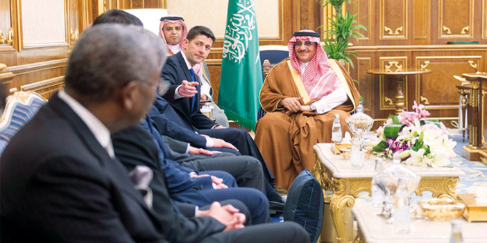 بحث صاحب السمو الملكي الأمير محمد ابن نايف بن عبدالعزيز ولي العهد نائب رئيس مجلس الوزراء وزير الداخلية - حفظه الله - مع رئيس مجلس النواب الأمريكي بول راين، عدداً من الموضوعات ذات الاهتمام المشترك في إطار آفاق التعاون والعلاقات التاريخية القائمة بين المملكة والولايات المتحدة الأمريكية. جاء ذلك خلال استقبال سمو ولي العهد في قصر اليمامة أمس لرئيس مجلس النواب الأمريكي يرافقه عدد من أعضاء المجلس. حضر الاستقبال معالي وزير الخارجية الأستاذ عادل بن أحمد الجبير، ومعالي مدير عام المباحث العامة الفريق أول عبدالعزيز بن محمد الهويريني، وسفير الولايات المتحدة الأمريكية لدى المملكة جوزيف ويستفول.