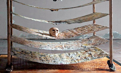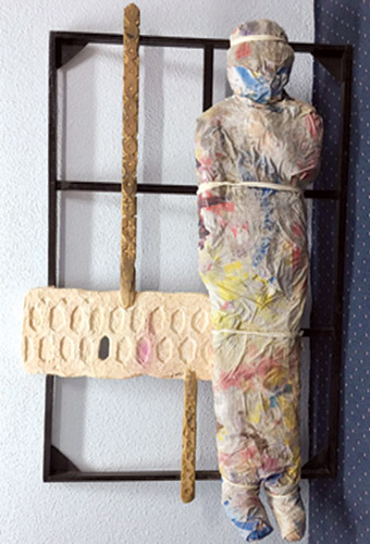 إنشاء تركيبي تداخلت فيه أكثر من خامة (خيش، شبك، معاجين، أقمشة قديمة)، عمل شغلت كتلته المنتصبة حيزا من أرضية مقدمة المعرض، مع تلاوين تجريدية على الكنفاس، معلقة على الجدار، تقابلها في الجهة الأخرى، مجموعة كراة مبعثرة، ويتوسطهما الجدار الأوسط بقطع مجسمة على شكل عصي مترادفة بإيقاع منتظم.