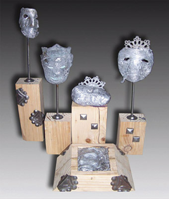 وثمة عمل مفاهيمي تركيبي للفنانة مهدية آل طالب أنجزته في 2009 م عرضته خارج القطيف ولم يكن ضمن معارض الجماعة، وهو بعنوان (الأقنعة). ينبرئ عمل الفنانة مهدية آل طالب بصمت ملتبس ويشي بالتوجس والقلق لإيقاع الأقنعة، مختلفة الحجوم ذات الصبغة الرمادية واللون محمل بدلالة رمزية غامضة، عمل يخاطبنا دون مواربة، موجه لكل ناظر اليه !وكأن لسان حال يقول، كم من الأقنعة نتخفى وراءها، فكل منا له قناع يتستر خلفه ؟ ومن الصعوبة أن نظهر كل ما نبطن، عمل يلقي الأسئلة دون صخب، بوح، وهمس، ومراجعة للذات الإنسانية.