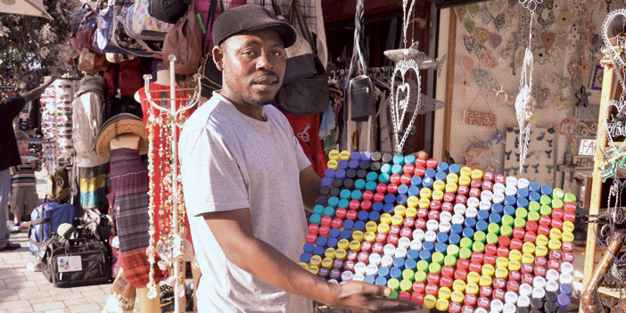 كل صباح يبدأ الحرفي دنغاي الجنوب إفريقي عمله في حانوته في كيب تاون بجنوب إفريقيا، والذي يبيع فيه أنواعاً مختلفة من المنتجات التي أبدعها بحرفية، وفن تصور حيوانات وأسماك وطيور اشتهرت بها جنوب إفريقيا عبر القرون. «الجزيرة» الكلمةً والصورةً كانت هناك وشاهدت إبداع دنغاي الحرفي الماهر والمبتسم والذي يشعرك بأنه سعيد جداً منذ لحظة دخولك عليه في حانوته أو محترفه الصغير والكبير بما يحتويه من منتجات أبدعها هذا الحرفي، بل نستطيع أن نقول إنه فنان فطري. والجميل أنه يوظف بدقة كل ما لا يخطر على البال من مخلفات أغطية المشروبات والمرطبات أو بقايا الأسلاك أو الأصداف البحرية المتنوعة والتي يحسن توظيفها بصورة لافتة، ويحولها لأعمال فنية جميلة. وعن أسعار منتجاته قال: إنها بالطبع تختلف بحسب نوعية المنتج، فهناك عمل بـ 20 رانداً (عملة جنوب إفريقيا) إلى 100 راند وهكذا. وعن الإقبال على شراء المنتجات، أجاب: هناك إقبال كبير خصوصاً في مواسم الإجازات والصيف. إضافة إلى أن بعض تجار التحف والتذكارات في أوروبا وأمريكا يطلبون منا كميات بين فترة وأخرى نقوم بشحنها لهم، وعلى الأخص المنحوتات الخشبية، والتي أبدع فيها الفنان الإفريقي بصورة عامه.. وأضاف أنها باتت في السنوات الأخيرة مطلوبة جداً بعدما قام العديد من فناني العالم بتوظيف الفن الإفريقي في مختلف أعمالهم من رسوم ومنحوتات.