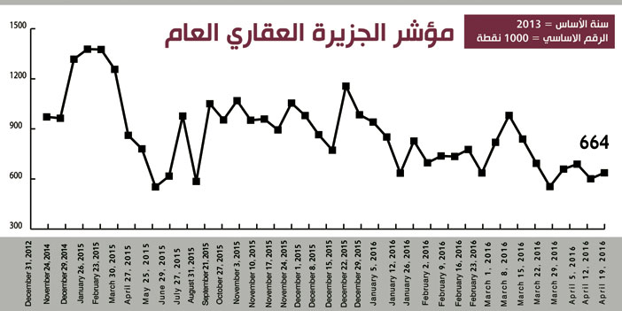 توضيح: «مؤشر الجزيرة العقاري» هو أول مؤشر عقاري والوحيد على مستوى المملكة، حيث يقيس حركة النشاط في القطاع العقاري في المملكة بشكل أسبوعي للعقار العام (سكني وتجاري) وكذلك مؤشر للعقار السكني وآخر للتجاري وقد وضعنا «سنة الأساس للمؤشر 2013 وقيمة الأساس 1000 نقطة» لجميع المؤشرات، وأن هذا التقرير للمعلومة فقط ولا يحمل أي نصيحة أو توصية، حيث قمنا بعملية جمع بيانات هذا التقرير من مصادرها بحرص وعناية ومن ثم قمنا بعملية تحويلها إلى مؤشرات.