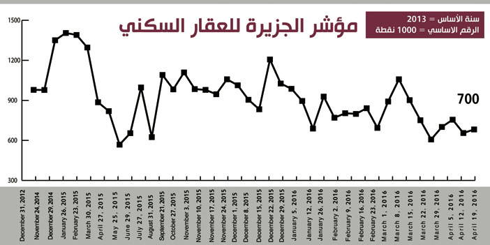 سجل مؤشر الجزيرة للعقار السكني ثاني ارتفاعا اسبوعيا له حيث ارتفع بنسبة 0.4 بالمائة خلال تداولات الأسبوع الماضي ليغلق عند مستوى 700 نقطة، مقارنة بإغلاق 697 نقطة للأسبوع قبل الماضي، أي ارتفع بثلاث نقاط أساس. وجاء هذا الارتفاع نتيجة النشاط الكبير في قطاع الأراضي الزراعية التي تندرج تحت القطاع السكني حيث ارتفعت بنسبة 38 بالمائة، وفي المقابل انخفض النشاط في قطاع الأراضي السكنية بشكل طفيف وبنسبة 0.5 بالمائة، كذلك انخفض النشاط في قطاع الشقق السكنية بنسبة 1.5 بالمائة، وتراجع قطاع العمائر بنسبة 55 بالمائة، وارتفع النشاط في قطاع الفلل بنسبة 14 بالمائة، كما ارتفع قطاع المرافق بنسبة 25 بالمائة. وارتفع متوسط قيمة المؤشر لآخر 3 أشهر بنحو نقطتين ليبلغ 692 نقطة، أي أن القيمة الحالية للمؤشر أعلى من قيمة هذا المتوسط بنحو 1 بالمائة، وبذلك يكون المؤشر أغلق للأسبوع الثاني على التوالي فوق قيمة متوسط 3 أشهر وما زال الوقت مبكرا للحكم أن النشاط في القطاع السكني شهد تحسنا بالفعل. وبالنظر إلى أداء المؤشر خلال 2016 فقد سجل ارتفاعا بنسبة 3.3 بالمائة، أما التغير في المؤشر منذ سنة التأسيس فهي منخفضة بنسبة 30 بالمائة.