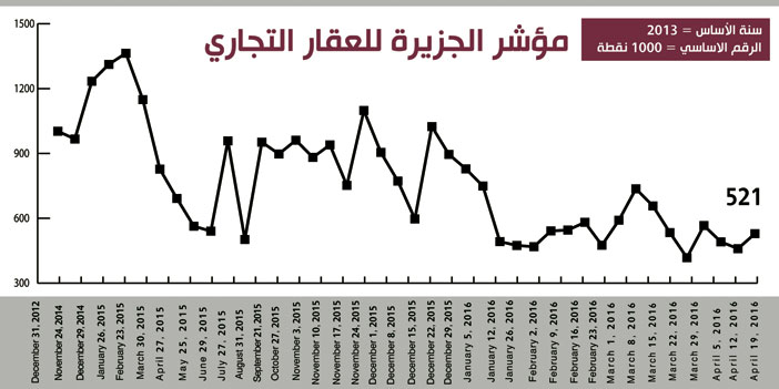 بضغط من قطاع الأراضي التجارية انخفض مؤشر الجزيرة للعقار التجاري بنسبة 4.2 بالمائة خلال تداولات الأسبوع الماضي ليغلق المؤشر عند مستوى 521 نقطة، مقارنة بإغلاق 544 نقطة للأسبوع قبل الماضي. وجاء هذا الانخفاض بالدرجة الأولى نتيجة تراجع النشاط في قطاع الأراضي التجارية الذي انخفض بنسبة 5 بالمائة والذي يشكل الوزن الأكبر في المؤشر التجاري، بالرغم من ارتفاع النشاط على قطاع الشقق التجارية بشكل كبير وبنسبة 67 بالمائة، وفي المقابل سجل النشاط في قطاع الأراضي الزراعية التي تندرج تحت القطاع التجاري، أما بالنسبة لمكونات المؤشر الاخرى فقد سجلت أغلبها انخفاضا في النشاط أو ثباتا، وقد بلغت قيمة متوسط مؤشر الجزيرة التجاري لآخر 3 أشهر 510 نقطة منخفضا عن مستواه السابق بنحو 3 نقاط أساس، وما زالت القيمة الحالية للمؤشر أعلى من قيمة هذا المتوسط بنحو 2 بالمائة، أي أن المؤشر ما زال يتداول ولعدة أسابيع فوق المتوسط. أما بالنسبة لأداء المؤشر التجاري منذ بداية العام الحالي 2016 فقد انخفض بنسبة 6.1 بالمائة، أيضا التغير في قيمة المؤشر منذ سنة التأسيس فلا يزال سلبيا وبنسبة 47.9 بالمائة.