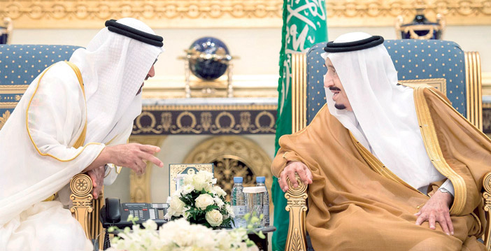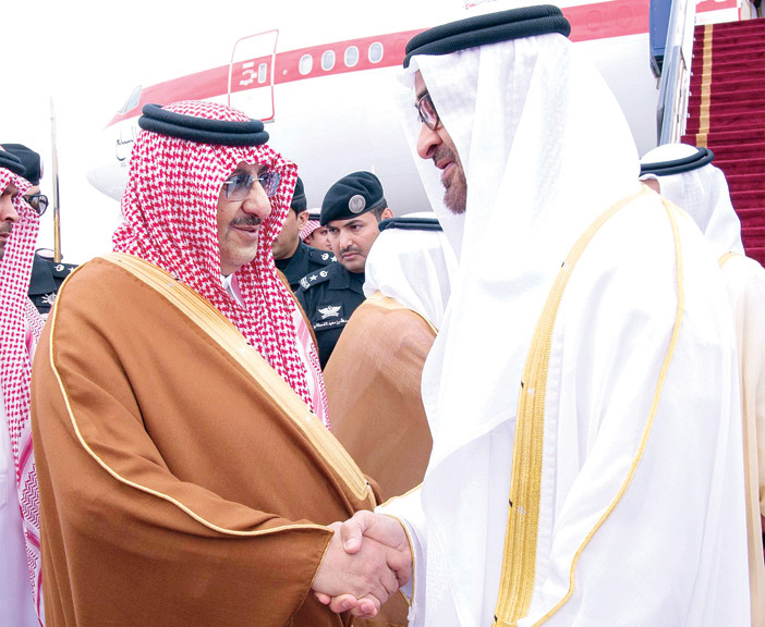 بعد ذلك صافح صاحب السمو الشيخ محمد بن زايد آل نهيان مستقبليه صاحب السمو الملكي الأمير خالد بن بندر بن عبدالعزيز مستشار خادم الحرمين الشريفين، وصاحب السمو الملكي الأمير الدكتور منصور بن متعب بن عبدالعزيز وزير الدولة عضو مجلس الوزراء مستشار خادم الحرمين الشريفين، وصاحب السمو الملكي الأمير متعب بن عبدالله بن عبدالعزيز وزير الحرس الوطني، وصاحب السمو الملكي الأمير عبدالعزيز بن سلمان بن عبدالعزيز نائب وزير البترول والثروة المعدنية، وصاحب السمو الملكي الأمير عبدالله بن مساعد بن عبدالعزيز الرئيس العام لرعاية الشباب، وصاحب السمو الملكي الأمير منصور بن مقرن بن عبدالعزيز مستشار خادم الحرمين الشريفين، ومعالي رئيس مجلس الشورى، وأصحاب المعالي الوزراء، وقادة القطاعات العسكرية.