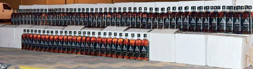 صرح الناطق الرسمي للمديرية العامة لمكافحة المخدرات العقيد سلمان بن حمد النشوان بأنه وفي إطار المتابعة الأمنية لنشاطات الشبكات الإجرامية والتي تمتهن تهريب المواد المخدرة وترويجها بالمملكة وبناء على ما توفر من معلومات للجهات المختصة بالمديرية العامة لمكافحة المخدرات عن عملية نقل كمية من المسكر الخارجي من المنطقة الشرقية إلى منطقة الرياض بواسطة احنة فقد تم تكليف فرقة أمنية من إدارة الرياض للتحري عنها وضبطها والقبض على المتورطين فيها , حيث تم بتوفيق الله التعرف على الشاحنة ورصدها وعمل نقطة اعتراض واستيقافها وضبط سائقها هندي الجنسية وبتفتيش الشاحنة عثر بها على ما عدده (80) صندوقا بداخلها تسعمائة وستون (960) زجاجة مسكر خارجي نوع سكواتش حيث قام المذكور بتغطيتها بمواد غذائية للتمويه على رجال الأمن كذلك توفرت لدى إدارة مكافحة المخدرات بالخرج معلومات عن كمية أخرى من الخمور الخارجية ستنقل من الخرج إلى الرياض فقد تم تكليف فرقة أمنية لضبطها وبعد التحري والمتابعة وجمع المعلومات أمكن التوصل للسيارة من نوع فان سافانا جي ام سي في إحدى المحطات بالخرج حيث تم بتوفيق الله ضبطها وسائقها سعودي الجنسية وبتفتيشها عثر على أنواع مختلفة من الخمور الخارجية والبيرة المسكرة بلغ مجموعها ألف وتسعمائة وأربعة عشر (1914) قارورة مسكر وعلبة بيرة ليصبح مجموع ما ضبط في الشاحنتين ألفان وثمانمائة وأربعة وسبعون (2874) زجاجة مسكر وعلب بيرة.