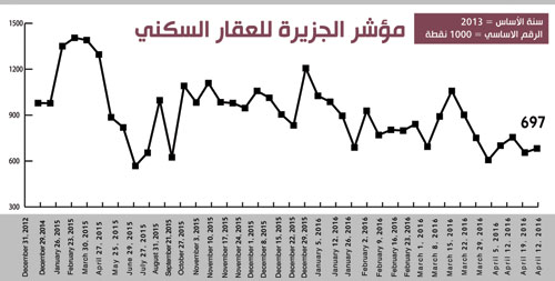 انخفض مؤشر الجزيرة للعقار السكني خلال تداولات الأسبوع الماضي بنسبة طفيفة بلغت 0.6 بالمائة ليغلق المؤشر عند مستوى 696 نقطة، مقارنة بإغلاق 700 نقطة للأسبوع قبل الماضي متراجعا أربع نقاط أساس. وسجلت مكونات المؤشر تباين في أدائها حيث ارتفع النشاط في قطاع الأراضي السكنية بنسبة 0.1 بالمائة، فيما سجل قطاع الشقق السكنية انخفاضا بنسبة طفيفة بلغت 0.3 بالمائة، وسجل قطاع الأراضي الزراعية التي تندرج تحت القطاع السكني أكثر انخفاضا في النشاط بنسبة 31 بالمائة، وحقق قطاعا الفلل والعمائر ارتفاعا بالنشاط بنسبة 15 بالمائة و30 بالمائة على التوالي. واستقر متوسط قيمة مؤشر الجزيرة السكني لآخر 3 أشهر عند مستواه السابق 692 نقطة، أي أن القيمة الحالية للمؤشر مقاربة عند لقيمة هذا المتوسط وبنفس الكلام السابق عن المؤشر العام ما زال القطاع السكني يعاني من ضعف واضح وخصوصا في قطاع الأراضي وقد يعود هذا إلى العديد من الأسباب سواء قرب رسوم الأراضي وضعف هوامش الربح للمطورين، كذلك ارتفاع تكلفة التمويل. وبالنظر إلى أداء المؤشر خلال 2016 فقد سجل ارتفاع بنسبة 2.7 بالمائة، أما التغير في المؤشر منذ سنة التأسيس فما زال منخفضا بنسبة 30.4 بالمائة.