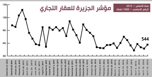 عاود مؤشر الجزيرة للعقار التجاري ارتفاعه خلال تداولات الأسبوع ليغلق المؤشر عند مستوى 539 نقطة، مقارنة بإغلاق 521 نقطة للأسبوع قبل الماضي، أي بنسبة ارتفاع بلغت 3.4 بالمائة. وسجل أغلب مكونات المؤشر ارتفاع في النشاط باستثناء قطاعي الشقق التجاري والاراضي الزراعية التي تندرج تحت القطاع التجاري حيث انخفض الأول بنسبة 10 بالمائة وانخفض الأخير بنسبة 1 بالمائة، وفي المقابل ارتفع قطاع الأراضي التجارية بنسبة 2.3 بالمائة، كذلك ارتفع قطاع العمائر بنسبة 5 بالمائة، وبنفس النسبة ارتفع قطاع المعارض والمحلات. وارتفعت قيمة متوسط مؤشر الجزيرة التجاري لآخر 3 أشهر بمقدار أربع نقاط أساس لتبلغ 514 نقطة، أي أن القيمة الحالية للمؤشر أعلى من قيمة هذا المتوسط بنحو 4 بالمائة، وما زال نلاحظ أن القطاع التجاري لا يزال أنشط بشكل واضح من القطاع السكني خلال آخر شهرين تقريبا. وبالنسبة لأداء المؤشر التجاري منذ بداية العام الحالي 2016 فما يزال منخفض بنسبة 2.9 بالمائة، كذلك التغير في قيمة المؤشر منذ سنة التأسيس لا تزال سلبية بنسبة 46.1 بالمائة.