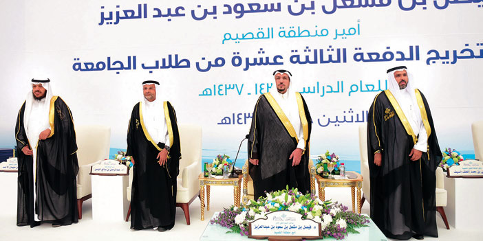 نقل صاحب السمو الملكي الأمير الدكتور فيصل بن مشعل بن سعود بن عبدالعزيز - أمير منطقة القصيم - مباركة خادم الحرمين الشريفين - يحفظه الله - لأبنائه وبناته الخريجين والخريجات منوهاً بأنه يحفظه الله يفخر ويعتز بهم كمخرجات لهذه الجامعة العريقة.