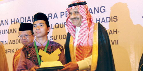 أشاد صاحب السمو الملكي الأمير خالد بن سلطان بن عبدالعزيز رئيس مجلس أمناء مؤسسة سلطان بن عبدالعزيز الخيرية بالعمل الخيري والإنساني الذي تقم به هذه البلاد في عدة دول إسلامية من أجل نشر الدين وحفظ القرآن الكريم بين شباب المسلمين وإيصال رسالة الدين الصحيح بعيداً عن الغلو والتطرف. وقال سموه في تصريح خاص لـ«الجزيرة» : عقب رعايته تسليم أكثر من150 طالب جوائزهم من دول آسيان والباسيفك ممتدحاً الدور الذي تقوم به إندونيسيا لاحتضان هذه المسابقة في عامها السابع.. ونحن نقدر الجهود التي تبذلها هذه الدولة وقيادتها من أجل النهوض بشباب الأمة من أجل التعايش والتسامح من دون أحقاد أو شحناء ومن دون تكفير أو عدوان.