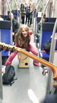 وتقول جودر التي تغني باسم «كيدو كات» إن مزاجهما كان جيداً عندما ركبتا القطار وبدأتا الغناء والعزف. وتضيف أنهما تفاجأتا عندما انضم إليهما أحد الركاب في أداء أغنية المطرب الأمريكي «برنس» الذي توفي يوم 21 أبريل الماضي.