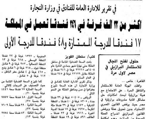 ويكشف هذا الخبر الذي نشرته صحيفة الجزيرة في 17/4/1988م أن عدد الغرف الفندقية في مختلف أنحاء البلاد كان يفوق 22 ألف غرفة في 246 فندقاً، بينما توضح آخر إحصائية أجرتها الهيئة العامة للسياحة والآثار أن عدد الغرف في العام 2014 تجاوز 230 ألف غرفة موزعة على 3662 منشأة متخصصة في الإيواء بواقع 144 ألف غرفة فندقية تقريباً ونحو 85 ألف غرفة في وحدات سكنية مفروشة.