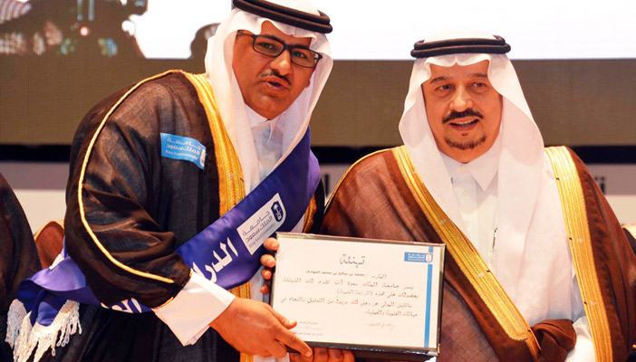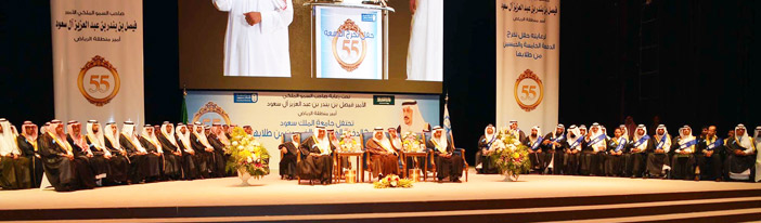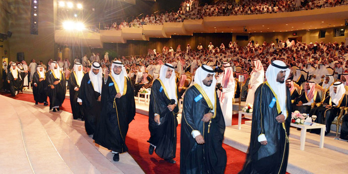 رعى صاحب السمو الملكي الأمير فيصل بن بندر بن عبدالعزيز أمير منطقة الرياض مساء أمس، حفل تخريج الدفعة الخامسة والخمسين من طلاب جامعة الملك سعود، وذلك بقاعة الشيخ حمد الجاسر بمبنى المؤتمرات بالمدينة الجامعية بالدرعية. وبدأ الحفل بمسيرة للخريجين البالغ عددهم 9647 طالباً في مختلف التخصصات والدرجات العلمية في مختلف التخصصات والدرجات العلمية دكتوراه، وزمالة، وماجستير، وبكالوريوس، ودبلوم عالي، ودبلوم مشارك، حيث بلغ عدد الطلاب الحاصلين على الدكتوراه 147، والزمالة 45، والدبلوم العالي 14، والماجستير 1652، أما الحاصلون على درجة البكالوريوس فقد بلغ عددهم 7199، كما بلغ إجمالي المتخرجين في برامج درجتي الدبلوم والمشارك 590. بعد ذلك بدئ الحفل الخطابي بتلاوة آيات من القرآن الكريم، ثم ألقى معالي مدير جامعة الملك سعود الدكتور بدران العمر كلمة رحب فيها بسمو أمير منطقة الرياض لرعايته الحفل وبالحضور من أولياء أمور الطلاب، وقال: إن وطنُنا العامرُ يمر في هذه المرحلةِ ببرنامجِ تغييرٍ واعد في مرحلةٍ بالغةِ الأهميةِ والحساسية من عمرِ الوطن، مرحلة حافلة بالعملِ والتجديدِ والتطوير، إنها مرحلة إنتاجِ وطنٍ جديد بصفاتٍ عصرية تستلهم التحولاتِ الحديثة، وتتعاطى مع ظروفِ المرحلة، إننا في عصرِ التحول، عصرِ التحولِ الوطني، عصرِ الرؤية الجديدةِ للوطن، إننا نقف على العتبةِ الأولى لسلمٍ من التطويرِ والنهضةِ سيحلقُ بنا عالياً في رؤية تصل مرحلتُها الأولى إلى العام 2030م، تستثمرُ الإمكانات، وتستغلُّ الفرص، وتتكئ على نقاط القوة، وتستحدِث منابعَ اقتصادٍ جديد، لتؤمِّنَ حياة الأجيالِ القادمة، برؤية شجاعة طموحة، واقعية متزنة، ستجعلُ لنا ولوطنِنا شأناً كبيراً بإذنِ الله.. بعد ذلك ألقى سمو الأمير فهد بن سلطان بن فرحان كلمة الخريجين رحب فيها بسمو أمير منطقة الرياض والمعالي لتشريفهم حفل تخرجهم، وقال: إنه لمن دواعي الفخر والاعتزاز أن أقف بين أيديكم في هذه الأمسية المباركة التي أضاءت أنوارها ونضجت فيها ثمار المعرفة فحان قطافها، نحييكم بتحية يفوح شذاها ليعم كل الأمكنة والأرجاء، تحية سداها الحب والوئام ولحمتها التقدير والاحترام، عاداً تشريف سمو أمير منطقة الرياض هذه الليلة إنما يدل على تجسيد عملي للعلاقة التي تربط بين أفراد هذا المجتمع وولاة أمره،- حفظهم الله- وأضاف: إن الخريجين هم أبناء هذا الوطن الشامخ، يقفون في جانب اوطن يشدون من أزره، هم سند وحماة لوطننا الغالي، ضد كل ما يحيط به من أخطار ومكائد، هم جنود له ضد كل ما يهدد وحدته وأمنه وحدوده المصونة، كانت قلوبهم هناك مع جنودنا البواسل وهم يدافعون عن كرامة الوطن، يترحمون على شهداء الواجب ويعاهدون ولاة الأمر - حفظهم الله - على الذود عنه بكل ما يملكون، يوظفون ما تعلموه لخدمة دينهم ومليكهم ووطنهم، مخلصين صادقين أوفياء للعهد. إثر ذلك ألقى سمو الأمير فيصل بن بندر كلمة قال فيها «حفلكم أيها الإخوة في هذا المساء له لون وطعم ورائحة كلها ولله الحمد خير وبركة وعطور تتناثر يمينا وشمالا لهؤلاء الخريجين الذين ننظر إليهم نظرة تقدير واعتزاز، فالتهنئة للخريجين جميعا والشكر لكل من حضر حفلنا هذا في هذه الجامعة التي نعتز بها كجامعة عريقة على أرض الوطن أسست وانتجت رجالاً حملوا راية العلم والمعرفة والتخطيط والدراسة والبناء لنشكر هذه الجامعة ورجالها السابقين واللاحقين. وأضاف سموه: إن وطننا أيها الإخوة وطن ينتظر منا الشيء الكثير وطن ليس كل الأوطان فهو مهبط الرسالة ومهبط الوحي على محمد- صلى الله عليه وسلم- وتقوم على أرضه الأماكن المقدسة وقبلة المسلمين في أصقاع الأرض عموما لذلك لايختلف كثيرا عن أي مكان نسعد جميعا بوجود اخوان لنا من كل مناطق المملكة يجتمعون في هذه القاعة، هذا دليل الوحدة المتكاملة والتوحد على المنهج والمسيرة الحسنة، ونشكر الله سبحانه وتعالى على هذه العطاءات كما نشكر قياداتنا وعلى رأسها سيدي خادم الحرمين الشريفين الملك سلمان بن عبدالعزيز آل سعود الذي يعط