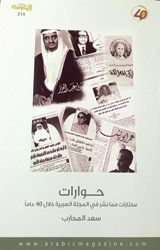 ضم كتاب القصائد أفضل ما نشر في المجلة العربية خلال 40 عاماً من قصائد وضم ما يقرب من 200 قصيدة متميزة لمعظم الشعراء في عالمنا العربي، وجاء الكتاب الثاني بحوارات بارزة مما نشر في المجلة العربية خلال 40 عاماً لشخصيات أدبية وسياسية واجتماعية، وضم ما يقرب من 60 حواراً متميزاً أجرتها المجلة العربية، أما الكتاب الثالث فضم استطلاعات لمجموعة من المدن داخل المربية السعودية، أما الكتاب الرابع فضم مجموعة من الدراسات الأدبية لنخبة من الأدباء والكتاب المتميزين في مجالهم على مدى 40 عاماً مما حوته المجلة خلال هذه الفترة، وجاء الكتاب الخامس بأفضل وأميز ما نشر في المجلة العربية خلال 40 عاماً من قصص قصيرة، وقد قام باختيارها القاص المتميز عبد العزيز الصقعبي، أما الكتاب السادس فضم مجموعة من الموضوعات الإعلامية والتي نشرت في المجلة العربية خلال 40 عاماً، وقد أعدها الإعلامي أ. سعيد الزهراني.