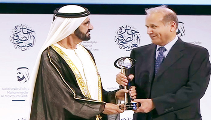 سلّم صاحب السمو الشيخ محمد بن راشد آل مكتوم، نائب رئيس دولة الإمارات العربية المتحدة ورئيس مجلس الوزراء وحاكم إمارة دبي ووزير الدفاع، جائزة «شخصية العام الإعلامية» للإعلامي الأستاذ عبد الرحمن الراشد المدير العام السابق لقناة العربية، وذلك خلال حفل توزيع جوائز منتدى الإعلام العربي الخامس عشر المنعقد في دبي - الإمارات العربية المتحدة.