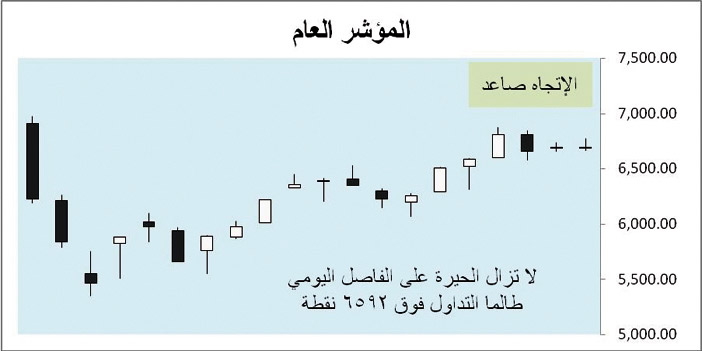 افتُتح المؤشر العام الأسبوع الماضي على هبوط وصعود طفيف بنمط شرائي ضعيف، مع تراجع للسيولة المجمعة بمقدار 9 %، لكنه حافظ على الاتجاه الصاعد. وكان سبب هذا التذبذب المربك هو تقلب أسعار النفط أمام العملة الخضراء؛ ما يوحي بضعف الطلب على النفط رغم تراجع شهية المخاطرة في أسواق النفط، إلا أن برنت لم يستفد كثيرًا من السيولة التي تخرج من أسواق الأسهم، حتى سهم سابك لم يستطع منح المؤشر العام عزمًا قويًّا.