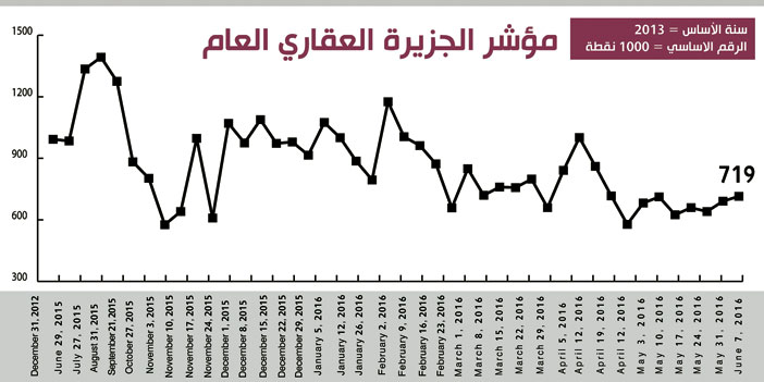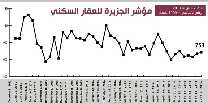 حقق مؤشر الجزيرة للعقار السكني ارتفاعاً بنسبة 3.5 بالمائة خلال تداولات الأسبوع الماضي ليغلق عند مستوى 753 نقطة مقارنة بإغلاق 728 نقطة للأسبوع قبل الماضي. وجاء هذا الارتفاع بدعم رئيسي من قطاع الأراضي السكنية الذي ارتفع بنسبة 3.7 بالمائة، كذلك سجل قطاع الشقق السكنية الذي يحتل المرتبة الثانية كوزن في المؤشر السكني ارتفاع بنسبة 2 بالمائة، أما بالنسبة إلى مكونات مؤشر الجزيرة السكني الأخرى فقد سجلت تباين في الأداء حيث انخفض قطاع الأراضي الزراعية التي تندرج تحت القطاع السكني بنسبة 9 بالمائة كذلك سجل قطاع الاستراحات انخفاض بالنشاط بنسبة 50 بالمائة، فيما حقق قطاع الفلل ارتفاع بالنشاط بنسبة 30 بالمائة ليواصل بذلك ارتفاعه لثالث أسبوع، وارتفع أيضا قطاع البيوت بنسبة 15 بالمائة. وقد بلغت قيمة متوسط مؤشر الجزيرة السكني لآخر ثلاثة اشهر فقد بلغت 694 نقطة تقريبا بنفس مستواه السابق، وترتفع القيمة الحالية للمؤشر عن قيمة هذا المتوسط بحوالي 9 بالمائة. وبالنسبة لأداء مؤشر الجزيرة السكني خلال العام الحالي 2016 فقد سجل ارتفاع بنسبة 11.1 بالمائة أما أدائه منذ سنة التأسيس فقد انخفض بنسبة 24.7 بالمائة.