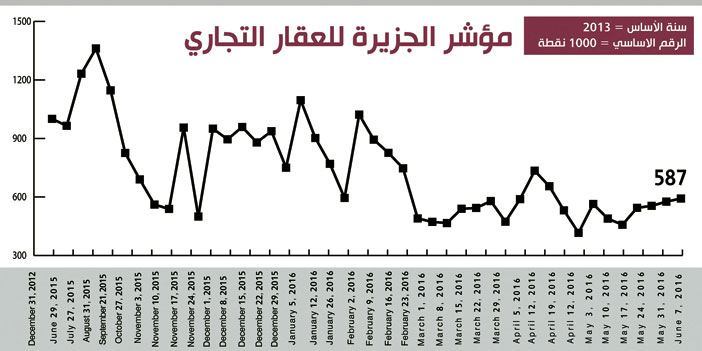 واصل مؤشر الجزيرة للعقار التجاري اتجاهه الصاعد والذي بدائه منذ منتصف شهر مارس الماضي، حيث ارتفع بنسبة 2.8 بالمائة خلال تداولات الأسبوع ليغلق عند مستوى 587 نقطة، مقارنة بإغلاق 571 نقطة للأسبوع قبل الماضي. وبالنظر إلى مكونات المؤشر، فقد سجل قطاع الأراضي التجارية ارتفاع بالنشاط بنسبة 3.6 بالمائة، كذلك ارتفع النشاط على قطاع الشقق بنسبة 47 بالمائة، فيما انخفض النشاط على قطاع الأراضي الزراعية التي تندرج تحت القطاع التجاري بنسبة 10 بالمائة. أما بالنسبة للقطاعات الأخرى فقد سجل أغلبها ارتفاع، حيث سجل قطاع البيوت التجارية أكبر نسبة ارتفاع بنحو 160 بالمائة، كذلك ارتفع النشاط بقطاع المعارض والمحلات بنسبة 150 بالمائة. فيما سجل قطاع العمائر التجارية أكبر تراجع بالنشاط بنسبة 75 بالمائة. أما متوسط قيمة المؤشر لآخر 3 أشهر فقد بلغت 533 نقطة مرتفع عن مستواه السابق بنحو 7 نقاط، وترتفع القيمة الحالية للمؤشر بنحو 10 بالمائة عن قيمة المتوسط، ولا يزال المؤشر التجاري أنشط وبشكل واضح من المؤشر العام والسكني خلال الثلاث أشهر الأخيرة. أما أداء المؤشر منذ بداية 2016 فقد حقق ارتفاع بنسبة 5.7 بالمائة. وبالنسبة لأداء المؤشر منذ سنة التأسيس فقد سجل انخفاض بنسبة 42.9 بالمائة.