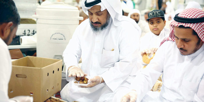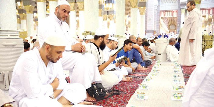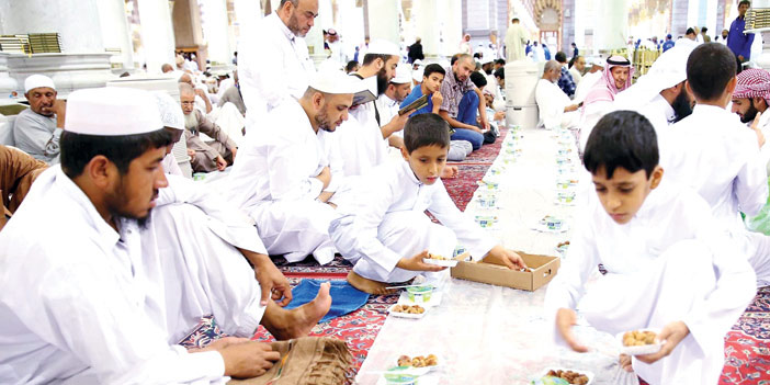تتجسّد في رحاب المسجد النبوي الشريف وساحاته الخارجية خلال لحظات ما قبل الإفطار, مشاهد عديدة تعكس عمق الترابط والتلاحم والأخوة الإسلامية التي تجمع مئات الآلاف من المصلين من مختلف الجنسيات, الذين يجلسون جنباً إلى جنب قبالة أكبر مائدة إفطار في العالم, وألسنتهم تلهج بالدعاء بشتى اللغات بأن يتقبّل الله صيامهم, ويستجيب لدعواتهم, وأن يجزيهم رحمة منه ورضوانا. وهيأت وكالة الرئاسة العامة لشؤون المسجد النبوي جميع الإمكانات والكوادر المؤهلة لتقديم الخدمات لحشود الصائمين رجالاً ونساءً من أهالي المدينة المنورة والزائرين الذين يتوافدون إلى المسجد النبوي في نهار رمضان للإفطار, وأداء الصلوات, حيث تعدّ سفر الإفطار مبكراً بطريقة مرتبة ومنظمة بإشراف عاملين ومراقبين في قسم الساحات وموظفي التوجيه والإرشاد, فيسمح داخل المسجد النبوي بدخول التمر والقهوة واللبن الزبادي والخبز فقط, في حين أن هناك ترتيبا خاصا وتدابير لتوفير الوجبات في الساحات الخارجية للمسجد حيث تقدّم أكثر من 100 ألف وجبة يومياً للصائمين, فقد تم تحديد مواقع في الساحات الشمالية والشرقية والغربية لموائد الإفطار روعي فيها الابتعاد عن الرخام الأبيض بمسافة كافية, وسعة الممرات بينها لمرور المشاة وعربات الخدمات, وفصل مواقع الرجال عن النساء. ويلزم أصحاب السفر في المسجد النبوي وساحاته بعدد من الضوابط والاشتراطات تشمل إحضار فرش مناسب يتسع للمائدة ولمن يجلس حولها, وأن تكون السفر من النوع السميك القوي الذي يُضمن عدم تمزقه عند رفعه عن الأرض, كما يمنع إحضار السوائل أياً كانت ما عدا اللبن والماء والعصائر المعبأة آلياً, وأن يكون محل إعداد الوجبات مرخصاً له من أمانة المدينة المنورة, كما يمنع إحضار الوجبات إلى الموقع قبل أكثر من ساعة ونصف من أذان المغرب, وعدم تقديم الوجبات على السفر قبل أكثر من نصف ساعة من أذان المغرب, بالإضافة إلى تقديم الوجبات في أطباق مناسبة تتوفر فيها الشروط الصحية, إلى جانب إلزام مقدمي الوجبات بارتداء القفازات اليدوية خلال تجهيز الوجبات وتقديمها, والاكتفاء بما يقدّم على السفرة, وعدم توزيع أي شيء خارج موقع المائدة, كما يتم التشديد على المساهمة في رفع بقايا الأطعمة والسفر عقب الإفطار مباشرة, بطريقة هادئة سليمة بحيث لا يسقط معها شيء على الأرض, وعدم فرش السفر في الممرات المخصصة لمرور المشاة وعربات الخدمات.