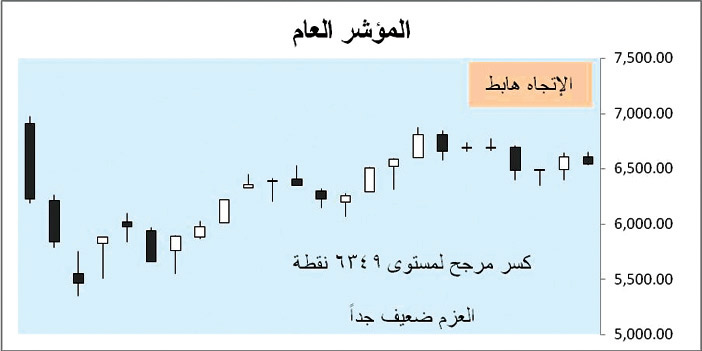 افتتح المؤشر العام الأسبوع الماضي على هبوط إلى 6534 نقطة، وأغلق على نمط بيعي على مستوى الحركة الأسبوعية داخل الاتجاه الهابط صاحبه تراجعا للسيولة لكن مما ساهم في الدفاع قليلاً سهم سابك ببقائه فوق حاجز الثمانين ريالا. ومع نهاية الأسبوع تراجعت خامات النفط وأسواق الأسهم العالمية بشكل كبير وهو متوقع حسب التحليل الفني. ويرجح الأسبوع المقبل أن يواصل السوق هبوطه ويكسر مستوى 6349 نقطة بسبب النفط.