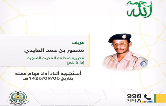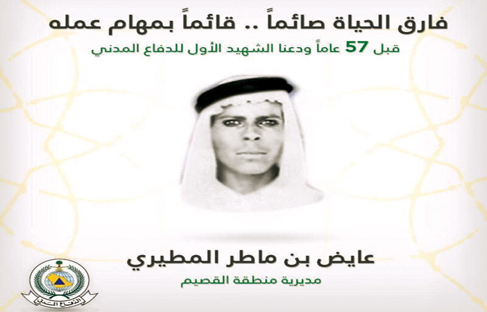 احتفت المديرية العامة للدفاع المدني بشهداء الواجب من رجال الدفاع المدني، الذين بذلوا أرواحهم في ميادين الشرف أثناء أعمال الإطفاء والإنقاذ. ونشرت المديرية العامة للدفاع المدني عبر حساباتها الرسمية بمواقع التواصل الاجتماعي صور شهداء الدفاع المدني في جميع مناطق المملكة وأسمائهم ونبذة مختصرة عن ظروف استشهادهم، مع الدعاء بأن يتغمدهم الله برحمته ومغفرته. وقامت المديرية باستبدال شعارها عبر حساباتها الرسمية بالشبكات الاجتماعية بصورة أول شهداء الدفاع المدني، الشهيد عائض بن ماطر المطيري الذي استشهد وهو صائم قبل 57 عاماً. كما نشرت لقاءً موجزاً مع عبدالله المطيري نجل الشهيد المطيري عبر حساب الدفاع المدني على «سناب شات».