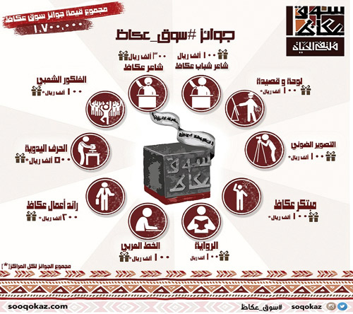 وأضاف: إن الجوائز التي تقدَّم لأول مرة في هذه الدورة شملت «جائزة الرواية» البالغ قيمتها 100 ألف ريال، و»جائزتي سوق عكاظ المعرفية» وقيمتهما 300 ألف ريال بواقع 200 ألف ريال «لجائزة رائد أعمال عكاظ» و100 ألف ريال «لجائزة مبتكر عكاظ».