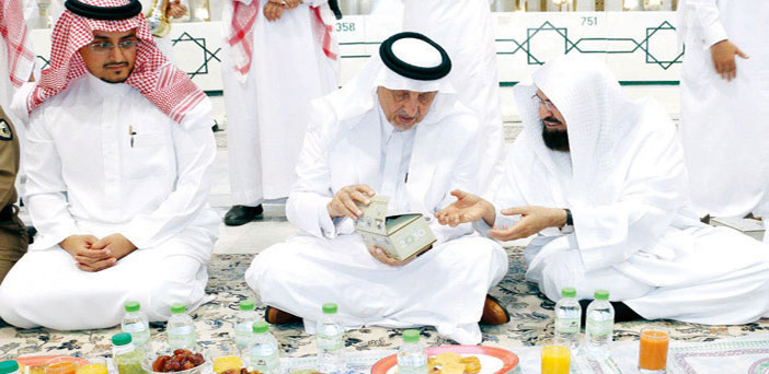 شارك صاحب السمو الملكي الأمير خالد الفيصل مستشار خادم الحرمين الشريفين أمير منطقة مكة المكرمة أمس المسؤولين في الحرم من مدنيين وعسكريين طعام الإفطار في المسجد الحرام, كما تفقد سموه مستشفى الحرم ونفق جرول الواصل بين شمال الحرم والتوسعة الشمالية للمسجد الحرام.