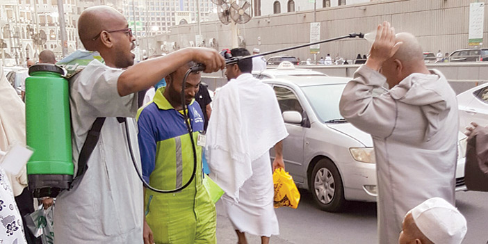 رصدت عدسة ( الجزيرة )في عمل غير مستغرب على أبناء هذا الوطن وهم يقومون بحمل جراكل المياه على ظهورهم ويتنقلون بين المعتمرين القاصدين دخول بيت الله الحرام قبل وصولهم للحرم برش رذاذ الماء للتبريد عليهم وهم يتجهون للحرم ويستهدفون كبار السن ومن بدأ عليه الإرهاق, حيث تبرد عليهم قطرات الماء قبل وصولهم لمحيط الحرم حيث ما وفرته الدولة أعزها الله بتثبيت أعداد كبيرة من المراوح العملاقة التي يتطاير منها الرذاذ في ساحات الحرم الخارجية لكن هؤلاء الشباب الذي رصدتهم عدسة الجزيرة وهم يقومون بهذا العمل ومنهم من استهدف عمال النظافة بالرذاذ لاسيما مع ارتفاع درجات الحرارة خلال فترة النهار وهم يؤدون عملهم دون انتظار إظهار ذلك؛ هدفهم خدمة ضيوف الرحمن وكسب الأجر والمثوبة من الله. تجدهم في كل مكان صغاراً وكباراً, وهم يرسمون صورة أبناء هذا الوطن الذين يتطوعون في خدمة ضيوف الرحمن في كل مكان على مدار العام. صور يجسدها شباب الوطن في خدمة ضيوف الرحمن بصور مختلفة من أعمال التطوع التي تقدم لضيوف الرحمن وهذا هو نموذج الشاب السعودي الذي يفخر بما يقوم به.