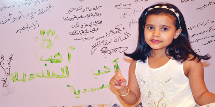 عبر عدد من الأطفال الصغار عن حبهم للوطن، وذلك خلال كتابتهم على «جدارية الوطن» ضمن الفعالية التي ينظمها الفريق النسائي احتفالاً بعيد الفطر المبارك في محافظة عنيزة، والتي جاءت ببرامج متنوعة تحت مسمى «فرحة عنيزة». واحتوت الجدارية التي نُفذت في مركز الملك فهد الحضاري على مشاعر زائرات الفعاليات واللاتي أبدين تجاوبن كثيراً، وكذلك الصغار اللذين كتبوا بأناملهم وباللون الأخضر «نحب الوطن.. نحب السعودية».