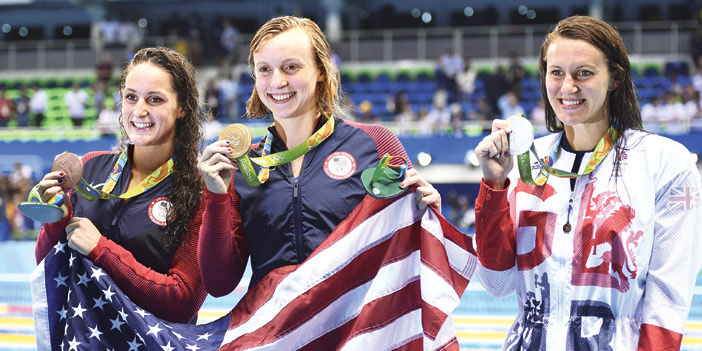 قبل ذلك، منحت كايتي ليديكي الولايات المتحدة ميداليتها الأولى في السباحة عندما حطمت الرقم العالمي في 400 م حرة، إذ سجلت 46ر56ر3 دقائق ماحية رقمها السابق الذي سجلته في أغسطس 2014 في استراليا والبالغ 37ر58ر3 د. وتفوقت ليديكي على البريطانية كارلين جاز (23ر01ر4 د) ومواطنتها ليا سميث حفيدة جون سيمث بطل البايسبول الاميركي عام 1919 (92ر01ر4 د). وهذه ثاني ذهبية أولمبية لليديكي (19 عاما) بعد سباق 800 م حرة في لندن 2012. كما هي ثاني ميدالية في ألعاب ريو للأميركية الشابة بعد فضية سباق 4 مرات 100 حرة السبت وراء أستراليا. وقالت ليديكي بعد فوزها: «بعد بطولة العالم 2013 في برشلونة حددت هدف الوصول إلى 56ر3 دقائق، لذا أنا سعيدة. كنت قريبة من تحطيمه (هذا الصباح)». وستكون فرصة ليديكي متاحة لتعزيز رصيدها عندما تخوض 200 م حرة و800 م حرة الذي تحمل رقمه القياسي العالمي. أما صاحبة الفضية جاز والتي عجزت عن التأهل لسباق لندن 2012: «قبل أربع سنوات كنت اشجع من المدرجات، الآن أمثل بريطانيا وأحرز ميدالية، لقد حققت حلمي.