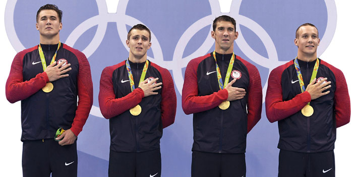 كان فيلبس ثاني المنطلقين في الفريق الأميركي، وطوق عنقه بالذهب مع كاليب دريسل وراين هيلد وناثان ادريان (92ر09ر3 دقائق) متقدمين على فرنسا، بطلة أولمبياد لندن 2012، ممثلة بمهدي ميتيلا وفابيان جيلو وفلوران مانودو وجيريمي سترافيوس (53ر10ر3 د) فيما نالت استراليا مع جيمس روبرتس وكايل تشالمرز وجيمس ماغنوسون وكاميرون ماكيفوي البرونزية (37ر11ر3). ونال فيلبس في الدورات السابقة 6 ذهبيات في اثينا 2004 و8 ذهبيات في بكين 2008 و4 ذهبيات في لندن 2012، وفضيتين في لندن 2012 وبرونزيتين في اثينا 2004. يشارك فيلبس (31 عاما) في أولمبياده الخامس في مسيرته وسيخوض أيضا 3 سباقات فردية هي 100 م و200 م فراشة و200 م متنوعة.