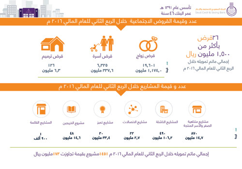 وذكر الناصر تفصيلاً لتوزيع تمويل المشاريع، حيث كان نصيب المشاريع المتناهية الصغر والأسر المنتجة 870 مشروعاً بقيمة 14.700.000 ريال، والمشاريع الناشئة 490 مشروعاً بقيمة 106.200.000 ريال، فيما بلغ عدد مشاريع التميز 20 مشروع تميز بقيمة 33.400.000 ريال، ومشاريع الخريجين بعدد 48 بقيمة 14.600.000 ريال، كما بلغت مشاريع الاتصالات 22 مشروعاً بقيمة 2.700.000 ريال، كما قام البنك بدعم مشروع قائم بقيمة 900.000 ريال. وأعقب الناصر، أن البنك وعلى صعيد دعمه للقروض الاجتماعية قدم وخلال فترة الربع الثاني من العام الحالي 26.052 قرضاً اجتماعياً بقيمة فاقت الـ 1.5 مليار ريال، توزعت على قروض الزواج والأسرة وترميم المنازل. حيث بلغت قروض الزواج (19.601) قرض زواج بقيمة 1.174.000 ريال ، فيما بلغت قروض الأسرة 6.325 قرض أسرة بقيمة 377.600.000 ريال، كما بلغت قروض ترميم المساكن 126 قرض ترميم بقيمة 6.300.000 ريال.