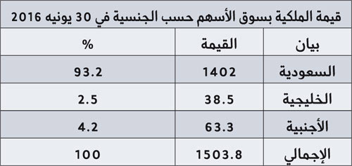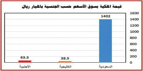 أما قيمة تملك الخليجيين فقد وصلت إلى 38.5 مليار ريال، وهي قيمة متدنية ونعلق الجرس حول انخفاض قيمها حتى الآن.. أما قيمة تملك كافة الجنسيات الأجنبية من مقيمين وغير مقيمين، فتصل إلى 63.3 مليار ريال .. بنسبة مساهمة 4.2%، وهي تمثل زيادة عنها منذ عامين حيث كانت لا تزيد على 1.5%.