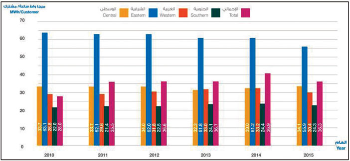 واتضح أن أعلى مؤشر استهلاك لعام 2015م بين مناطق المملكة كان في المنطقة الشرقية بـ56 ميجا واط ساعة/مشترك.
