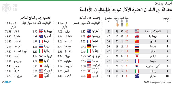 وحصد العرب 14 ميدالية في الأولمبياد البرازيلي هي ذهبيتان و4 فضيات و8 برونزيات، بينها 6 ميداليات نسائية وهي ذهبية واحدة ومثلها فضية و4 برونزيات.
