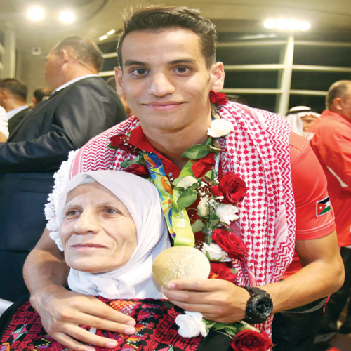 استقبل بطل التايكواندو احمد أبو غوش، الذي توج بميدالية ذهبية تاريخية بالنسبة للاردن لوزن تحت 68 كغم في دورة الألعاب الأولمبية في ريو دي جانيرو، الثلاثاء استقبال الابطال في عمان. وحصل أبو غوش على أول ميدالية ذهبية للأردن في تاريخ مشاركة هذا البلد الأولمبية منذ بدايتها في أولمبياد موسكو عام 1980. واستقبل العشرات ابو غوش مساء امس الاول الثلاثاء رافعين اعلام الاردن في مطار الملكة علياء الدولي، وبمجرد وصوله وهو يضع «الحطة الاردنية» الكوفية الحمراء والبيضاء على كتفيه، احتضن والدته التي كانت في انتظاره. وكان الطبق التقليدي الاردني «المنسف» حاضرا في صالات المطار ايضا في استقبال ابو غوش ومرافقيه من افراد البعثة اضافة لمستقبليه. وزينت الشوارع بصورة ابو غوش (20 عاما) وكتب عليها «شبابنا ثروتنا».