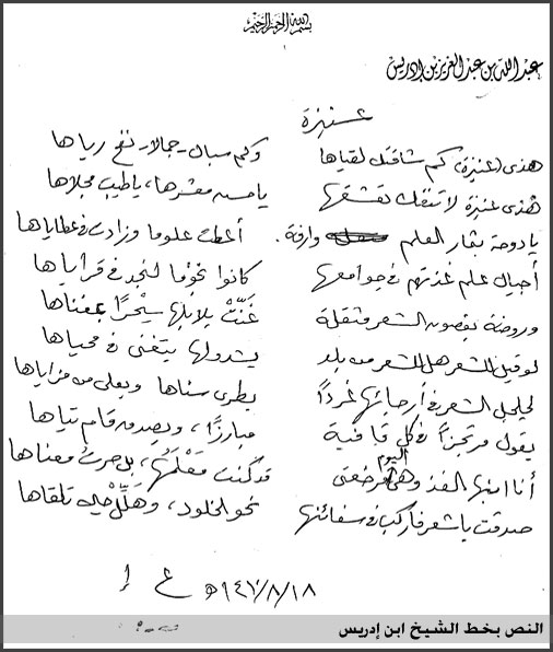 في يوم الخميس 18-8-1410هـ الموافق 15-3-1990م وبدعوة كريمة من معالي الشيخ عبد الله العلي النعيم رئيس مجلس إدارة الجمعية الخيرية الصالحية بعنيزة زار الشيخ الأديب والشاعر عبد الله بن عبدالعزيز بن إدريس -حفظه الله- (رئيس النادي الأدبي بالرياض في حينها) مركز صالح بن صالح الثقافي وكنت أنذاك عضو مجلس الإدارة وأمين عام الجمعية وقام بجولة على المركز اطلع خلالها على أهدافه ونشاطاته وفكرة إنشائه وبعد الجولة طلب من أحد مرافقيه أن يزوده بملزمة أوراقه الرسمية وجلس في إحدى الزوايا وكتب هذه الأبيات.