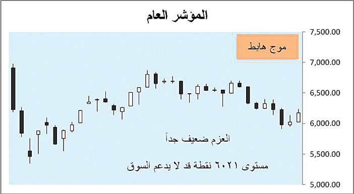 افتتح المؤشر العام الأسبوع الماضي على صعود، وصلت ذروته إلى مستوى 6238 نقطة بدعم من القطاع البتروكيماوي، وخصوصًا سابك التي سجلت أعلى مستوى للأسبوع عند 85 ريالاً، وصحب ذلك تداول عالٍ عند هذا المستوى؛ إذ أشارت مؤشرات العزم إلى ضعف في تلك الجلسة. لكن بشكل عام، ساهمت أسعار النفط نفسيًّا في إنهاء الأسبوع قبل الإجازة بنمط شرائي، لكنه ضعيف، وداخل مسار هابط لم يتغير حتى الآن، ولا تزال السلبية طاغية.