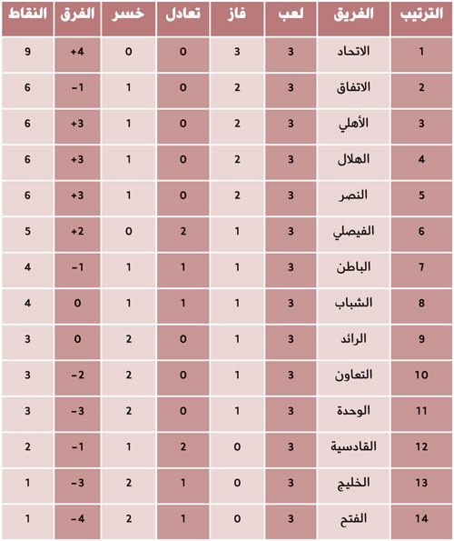 وفي مكة تصدر الاتحاد الدوري السعودي بالعلامة الكاملة (9 نقاط) بعد فوزه الكبير على الوحدة بخمسة أهداف لثلاثة سجل محمود عبد المنعم (كهرباء) أربعة منها (سوبر هاتريك) وأحمد العكايشي هدفا، وسجل للوحدة مدخلي وكامل الموسى وفريد.