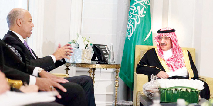 التقى صاحب السمو الملكي الأمير محمد بن نايف بن عبدالعزيز ولي العهد نائب رئيس مجلس الوزراء وزير الداخلية رئيس وفد المملكة في أعمال الدورة السنوية الـ71 للجمعية العامة للأمم المتحدة في مقر إقامة سموه بنيويورك أمس معالي وزير الأمن الداخلي الأمريكي جي جونسن، والوفد المرافق له. وجرى خلال اللقاء استعراض الموضوعات الأمنية ذات العلاقة خاصة فيما يتعلق بتعزيز التعاون القائم بين البلدين الصديقين في مجال مكافحة الإرهاب.
