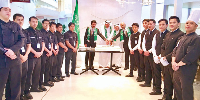 وفي نهاية الحفل شارك المهندس صالح الجاسر موظفي صالة الفرسان في تقطيع تورتة الكيك المعدة بهذه المناسبة والتي حملت شعار الوطن الغالي.