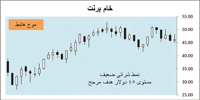 لا يزال خام برنت داخل المسار الهابط على مستوى الحركة الأسبوعية، وداخل منطقة حيرة على مستوى الحركة اليومية. وكان التذبذب حوالي 3 دولارات، ولم يهدأ حتى مع نهاية الأسبوع رغم زوال القلق من رفع سعر الفائدة على الدولار، وبشكل هو يطور نمط سلبي على مستوى الحركة الشهرية يستهدف مستوى 33 دولاراً ما لم ينه شهر سبتمبر الحالي فوق حاجز الخمسين دولاراً وهو ما لا نرجحه بسبب سوء أساسيات السوق.