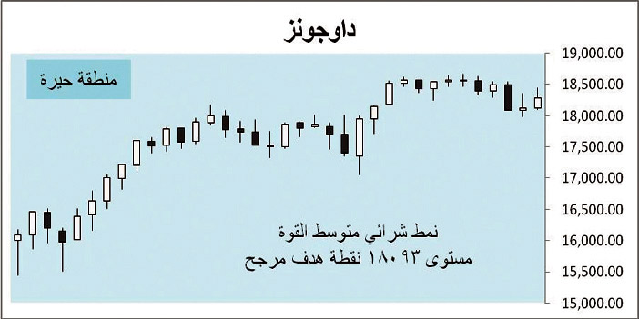 افتتح مؤشر الداوجونز الأسبوع الماضي على هبوط وصل قاعه إلى مستوى 18093 نقطة، ثم ارتداد إلى مستوى 18500 نقطة بتذبذب حوالي 400 نقطة أعاد مؤشر الداوجونز إلى منطقة الحيرة على مستوى الحركة الأسبوعية. وهذا السلوك، كان بسبب الغموض حول سعر الفائدة، لكن هذا الغموض تبدد مع نهاية الأسبوع على الأقل حتى إجتماع الفدرالي المقبل. ويرجح الأسبوع القادم أن يهبط الداوجونز مجدداً إلى مستوى 18093 نقطة .